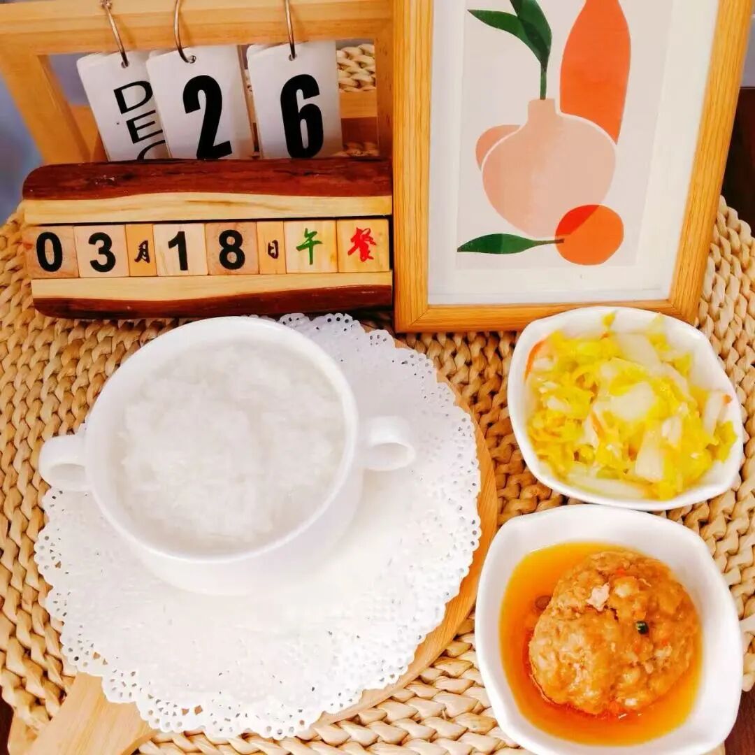 稀饭、红烧狮子头、清炒娃娃菜