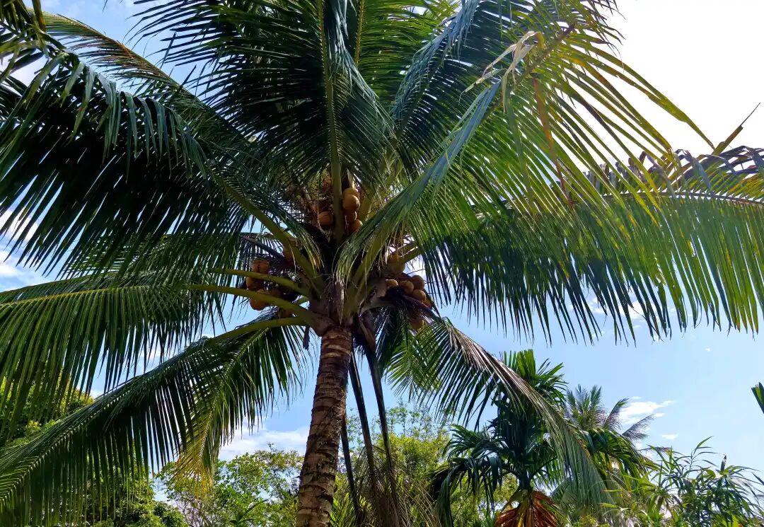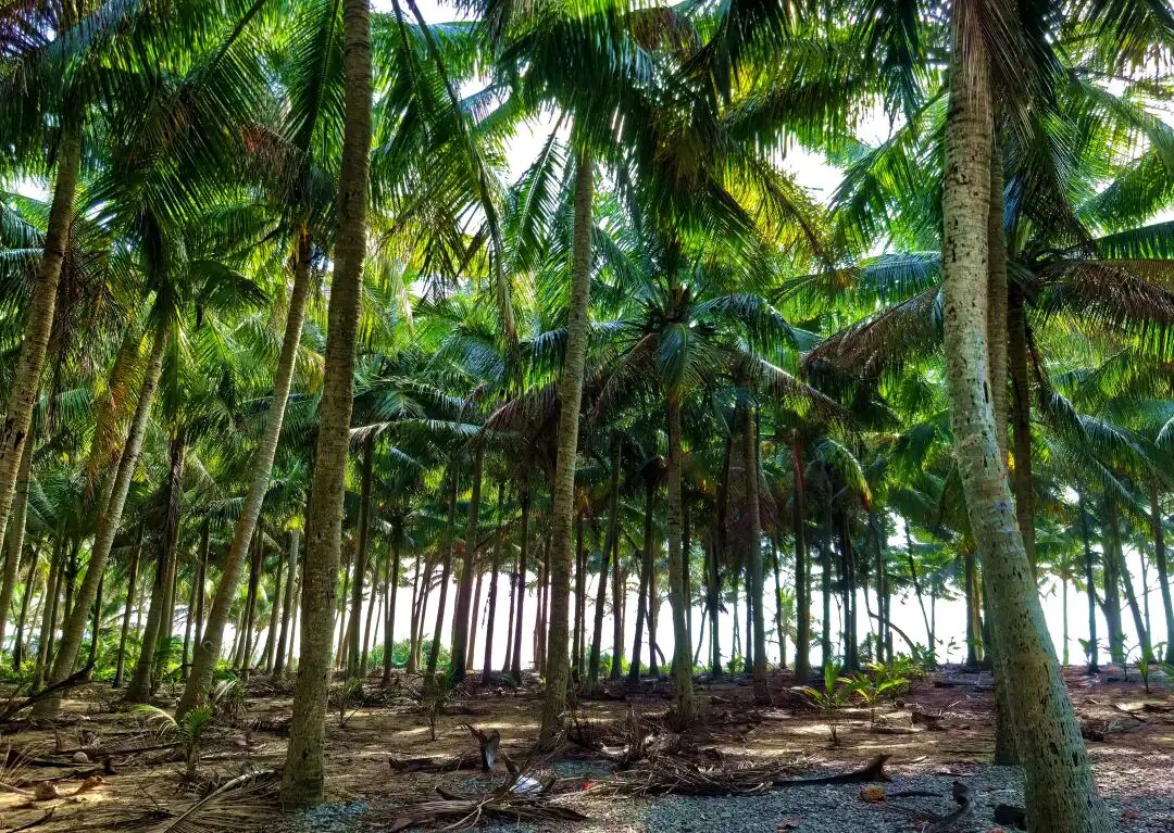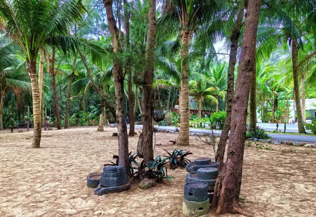 沙滩上,椰林婆娑,细沙柔和,阳光慵懒。