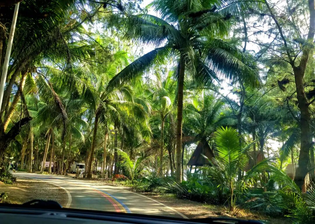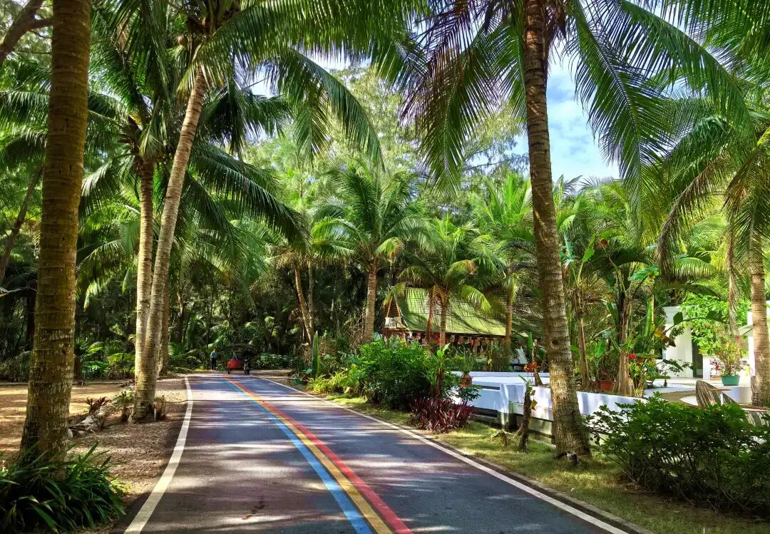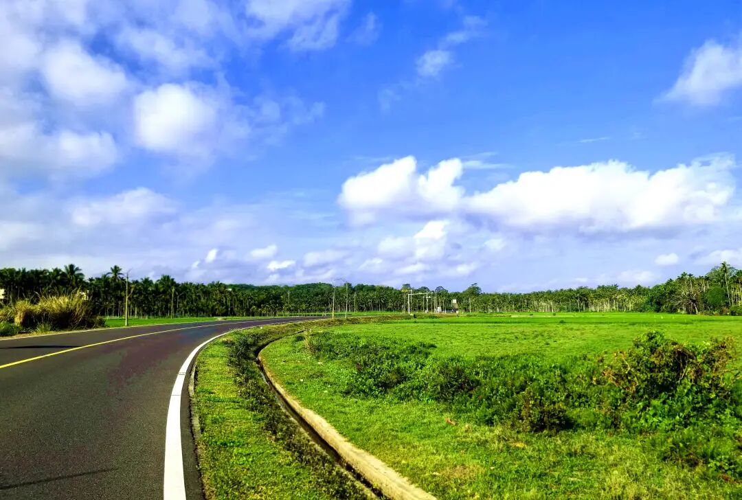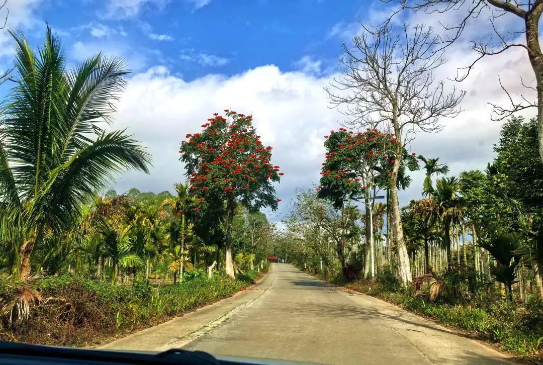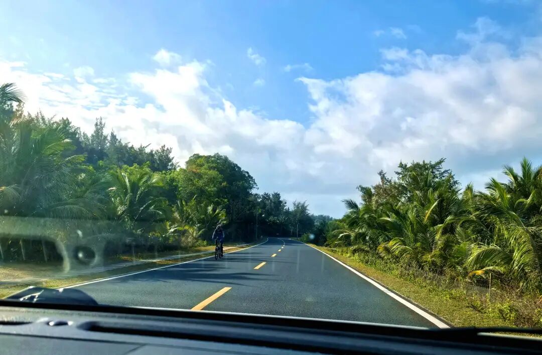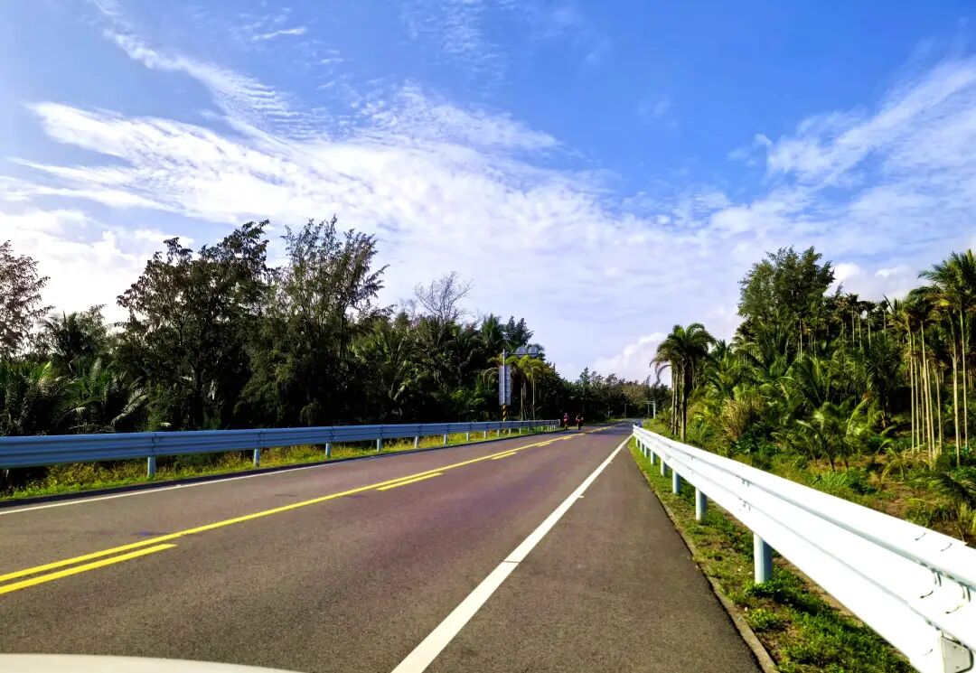 路边,海南岛标志性风景--椰林,椰树整齐排列道路两旁,树干粗壮,伞形树冠在风中摇曳生姿。