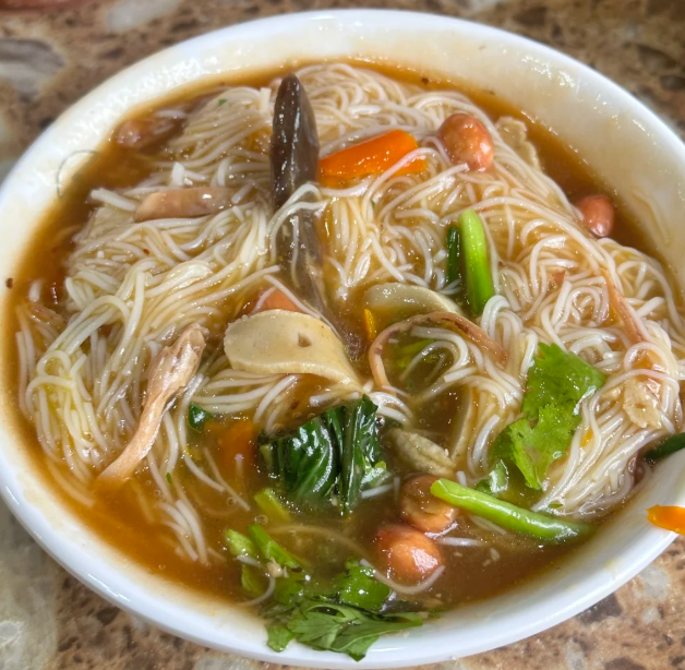 陵水酸粉的做法不复杂。米粉先烫熟,拌进秘制卤汁,再放牛肉干、小鱼饼、花生米、豆芽和香菜,最后用一点醋把味提起来。关键不在猛,而在分寸。酸一点,鲜一点,口就开了。