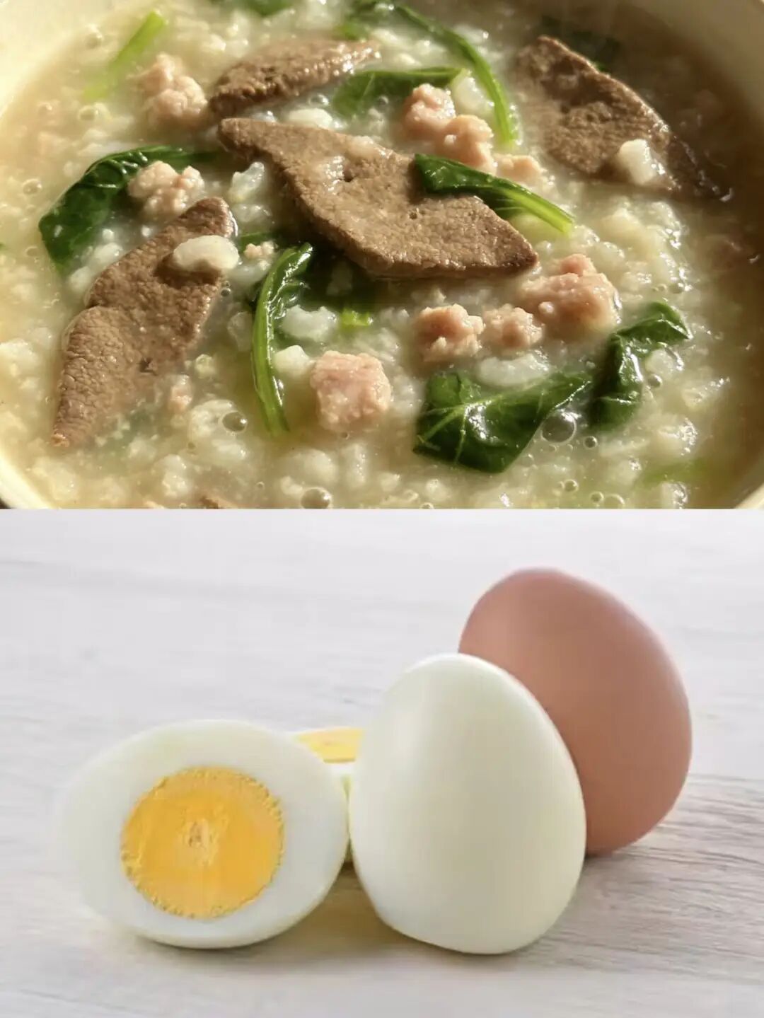 菠菜猪肝瘦肉粥、水煮鸡蛋