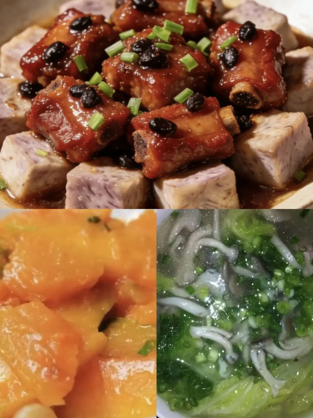 香芋豆豉蒸排骨、素炒南瓜葱花平菇青菜骨头汤、五常大米