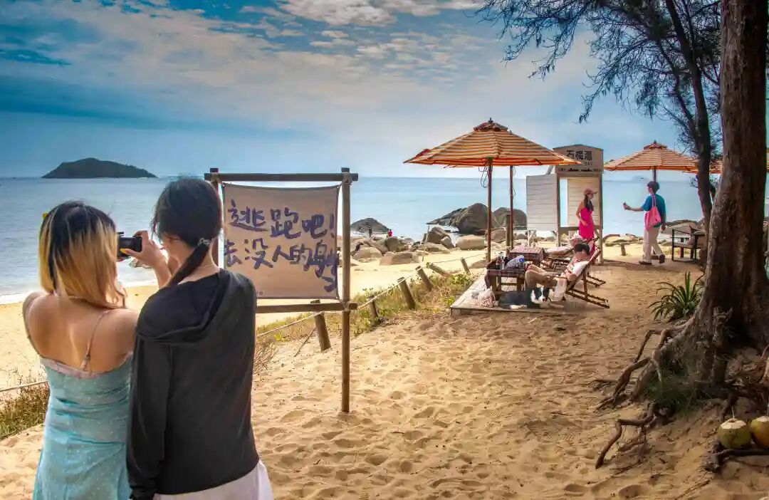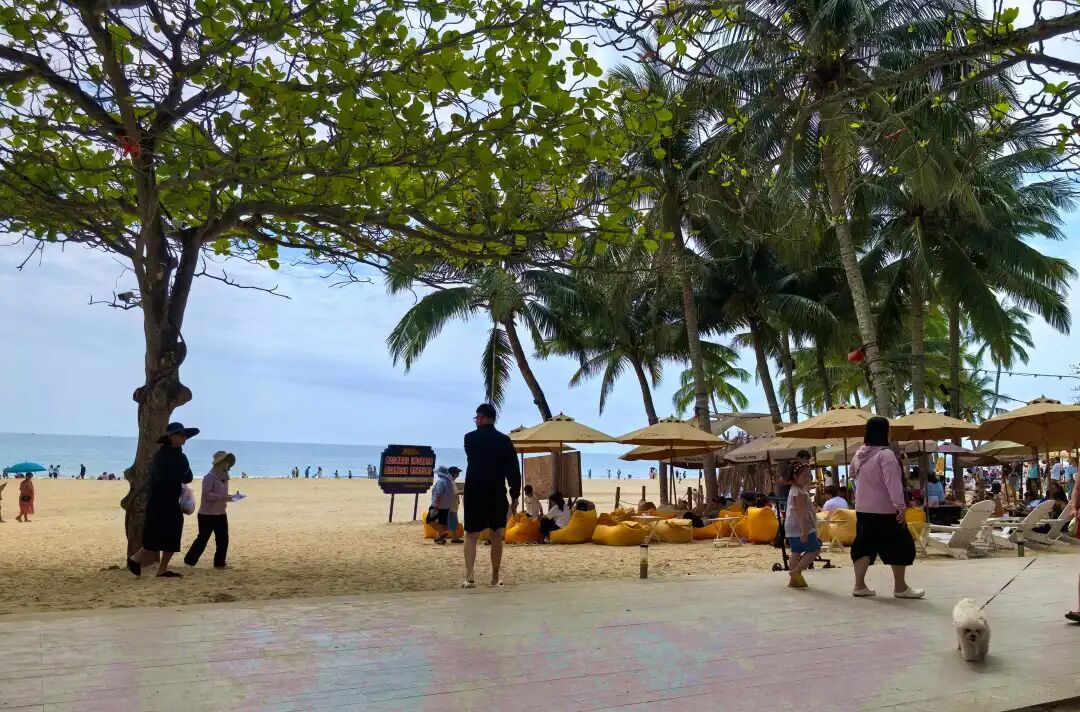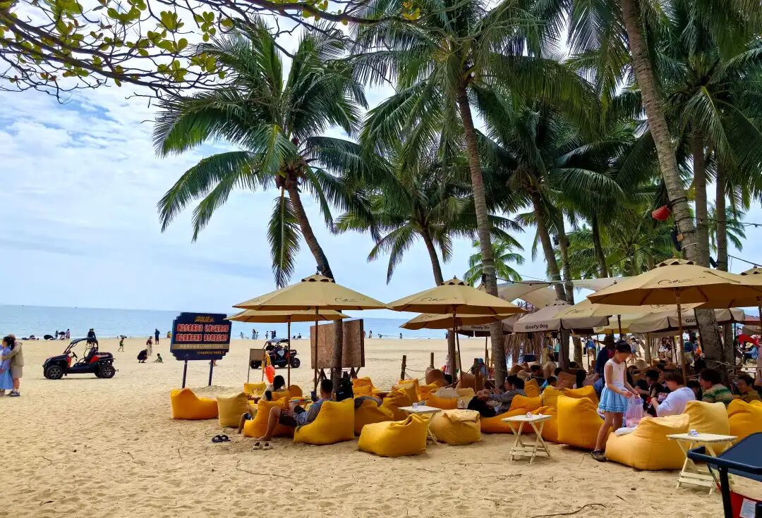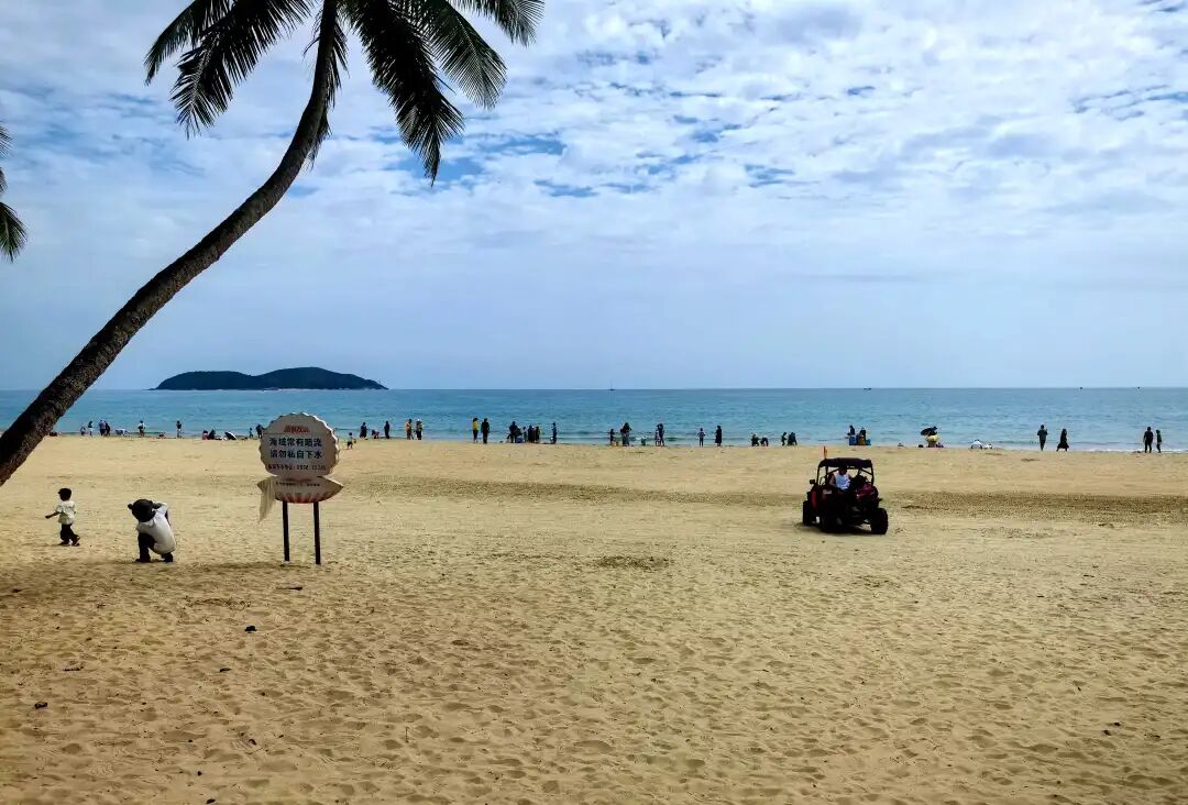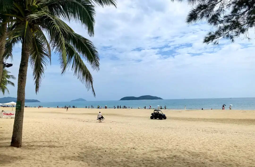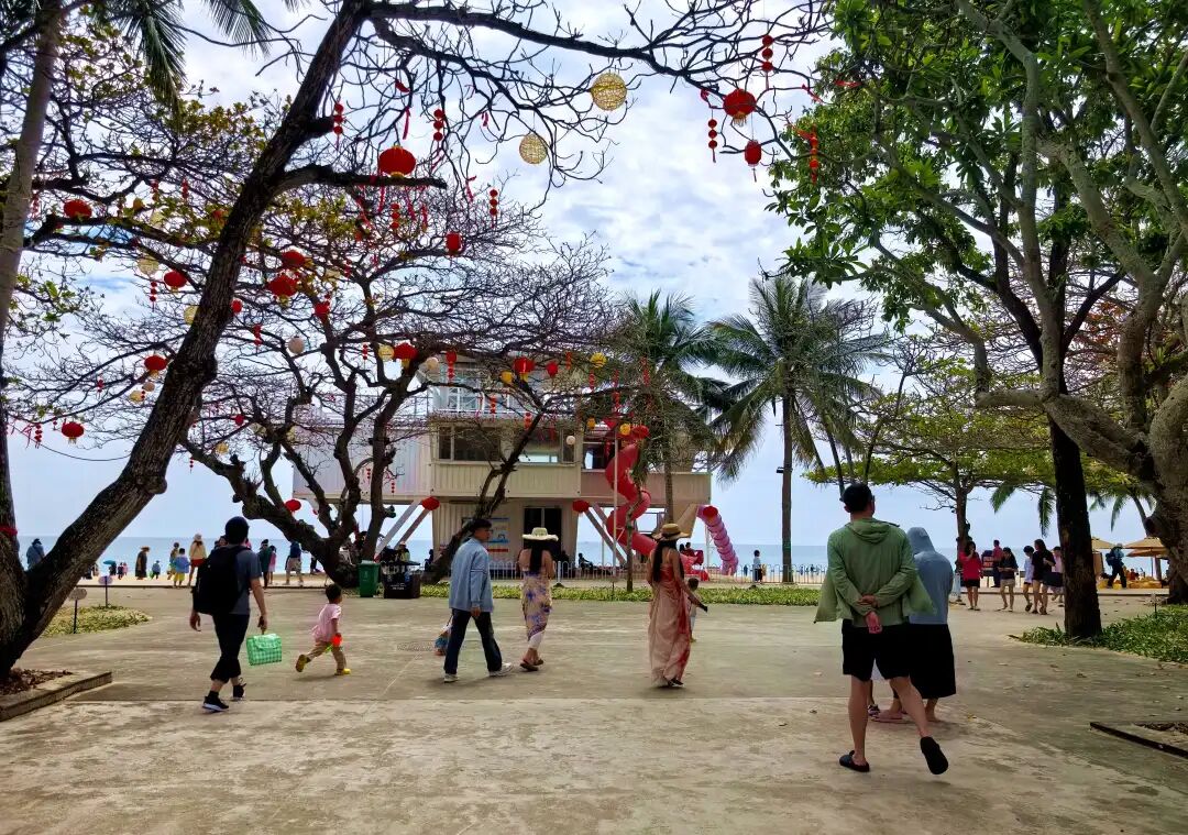 走出书屋,碧海银滩,细沙柔浪,游人们在海边拍照、戏水、观海、休闲、发呆