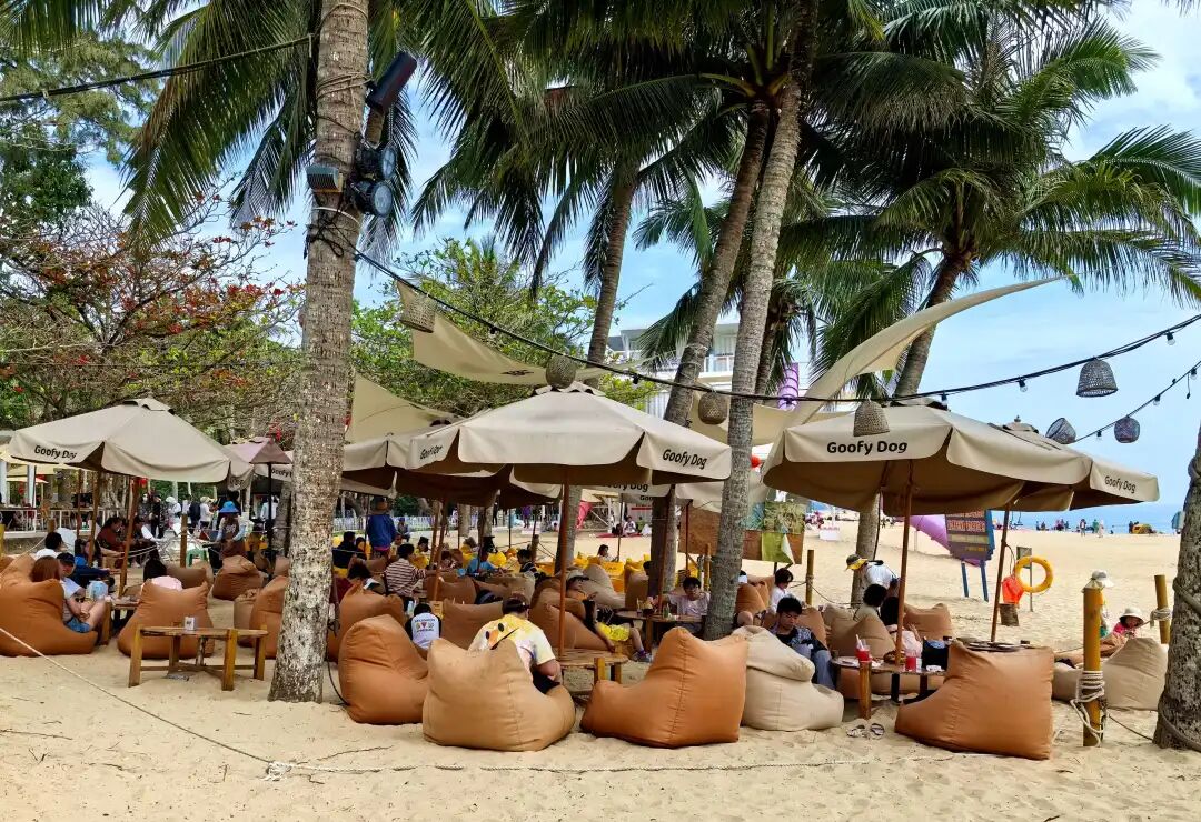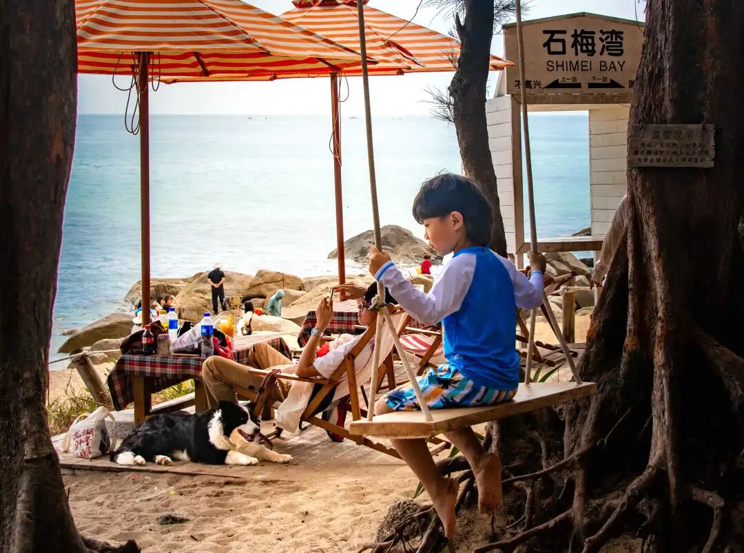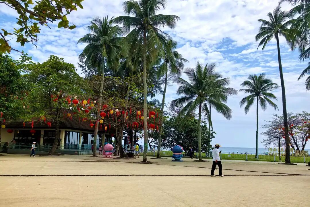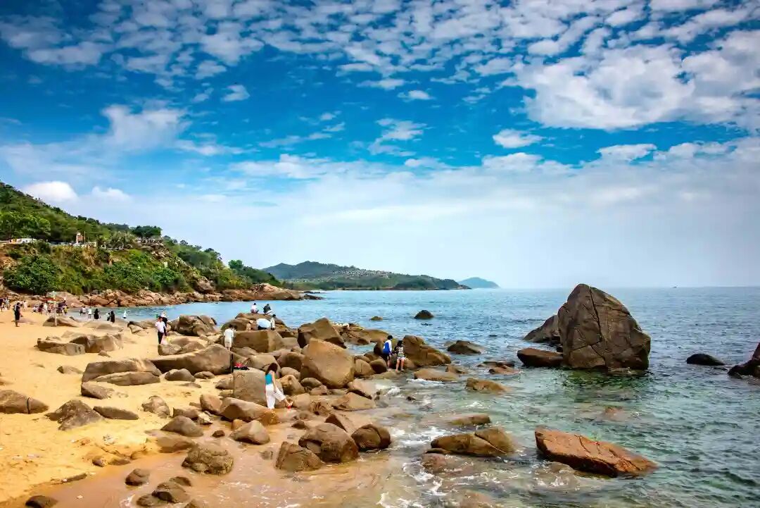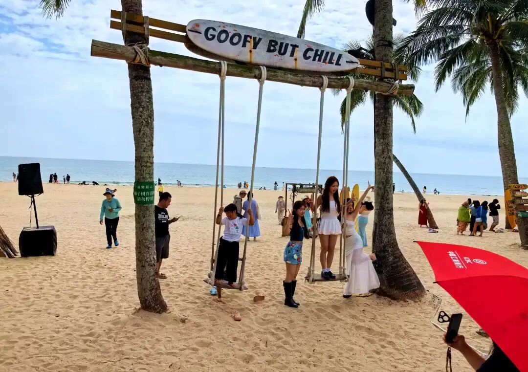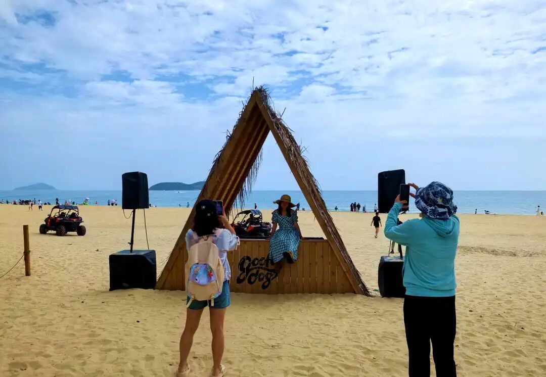 走出书屋,碧海银滩,细沙柔浪,游人们在海边拍照、戏水、观海、休闲、发呆