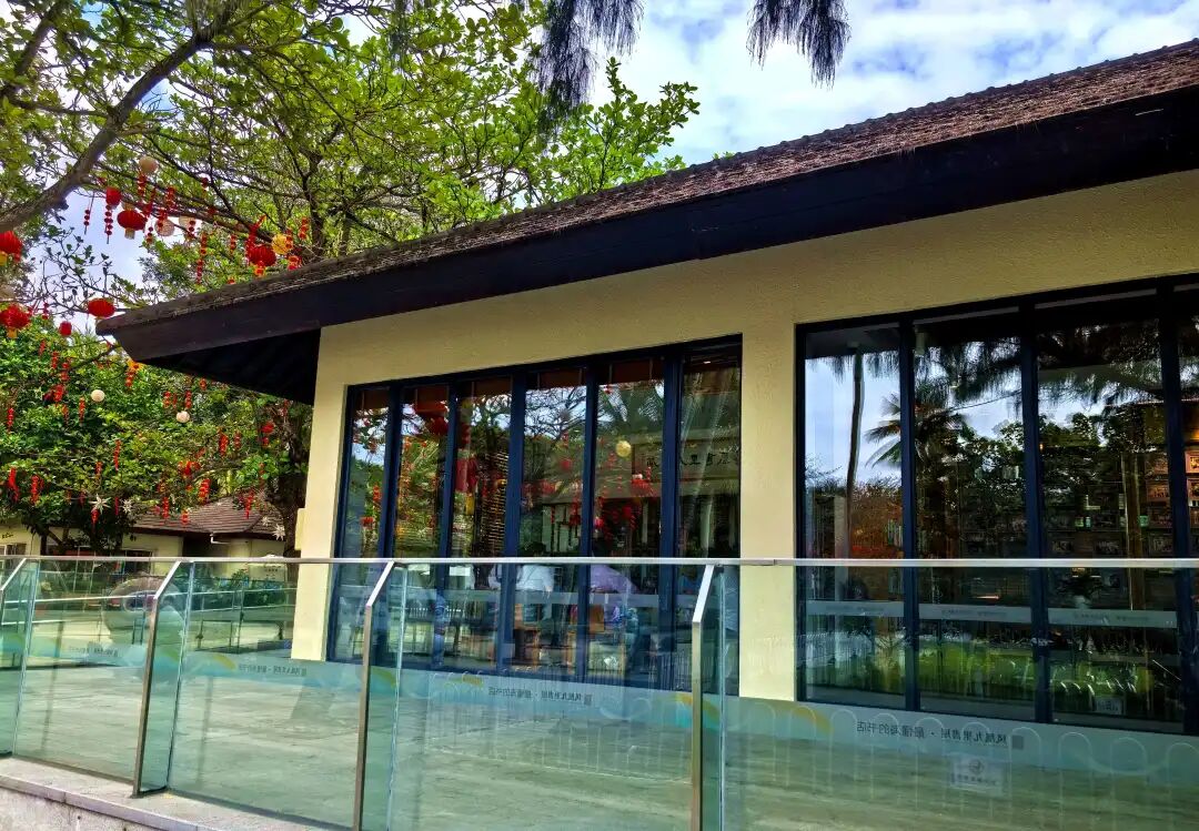 进了停车场走不远,可以看到碧海蓝天,椰林沙滩。左前方四面玻璃墙的房子便是书屋。