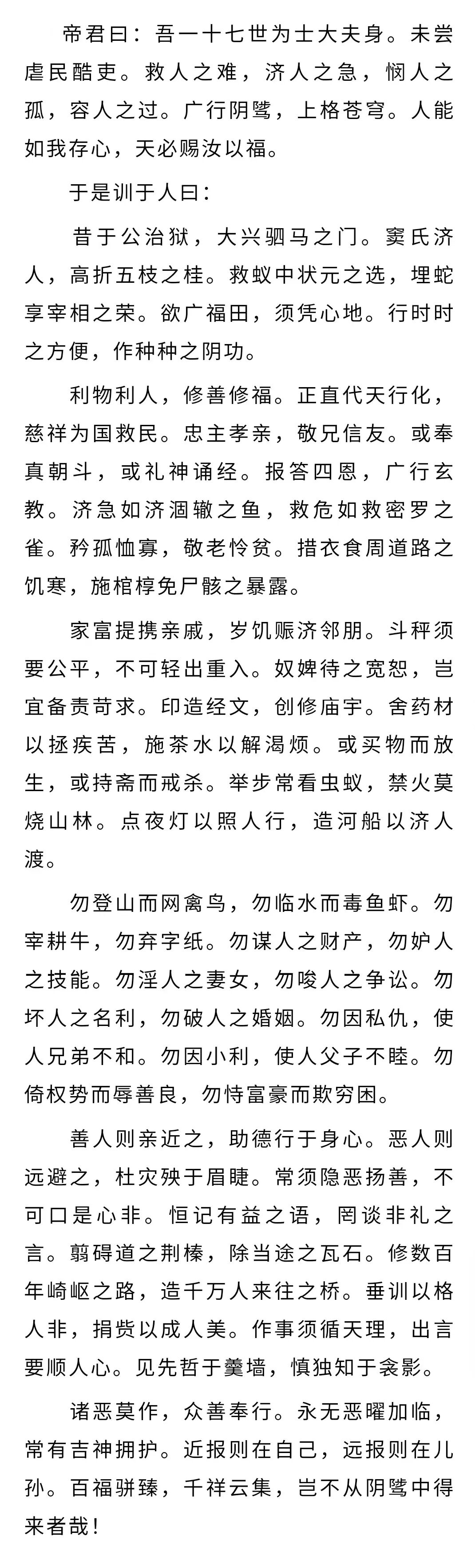 《文昌帝君阴骘文》简称《阴骘文》,道教劝善书。以人天道为基础,告诫人们为人处世的道理,从而达到理想的人生境界,是中华文化教人为善去恶的范本。