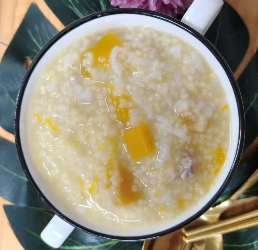 南瓜肉沫小米粥、水煮鸡蛋
