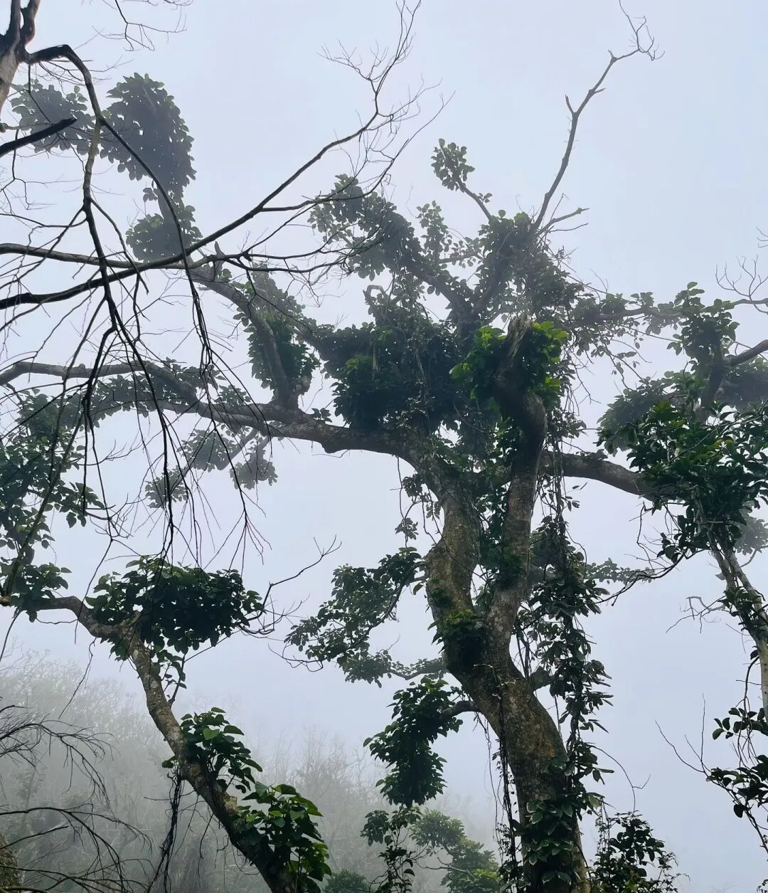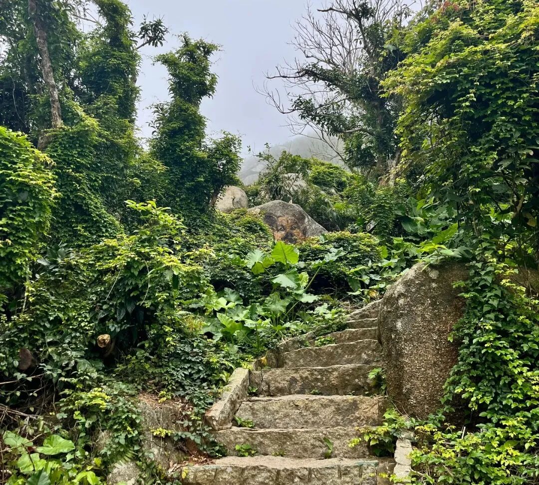 扎根岩石的迎客松傲然挺立,诉说着岁月的坚韧;结满野果的古藤缠绕枝头,增添了山野的野趣;偶尔窜过的小松鼠灵动可爱,为山林添了几分生机;漫山遍野的三角梅热烈绽放,在海风中摇曳生姿,将铜鼓岭装点得格外绚烂