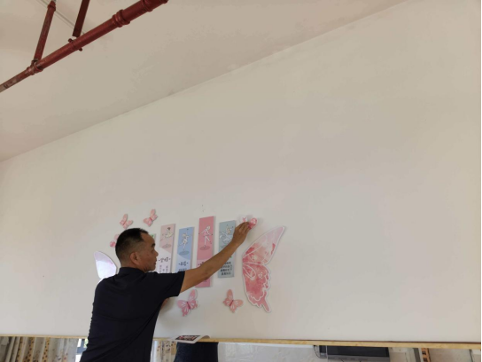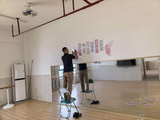 6、3月17日,郭学娟教研主任组织李美精粘贴幼儿舞蹈室环创。