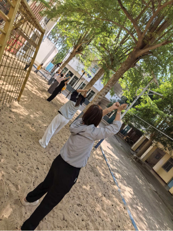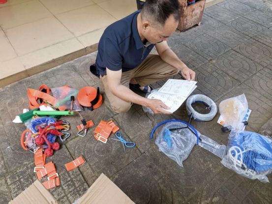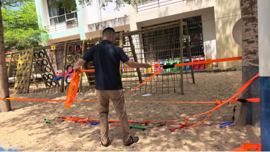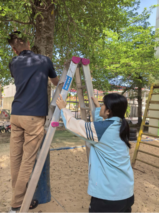 5、3月17日,郭学娟教研主任组织李美精及部分教职工安装滑索和攀爬秋千。