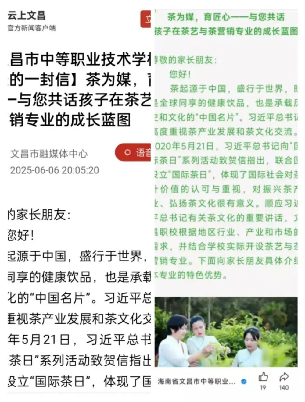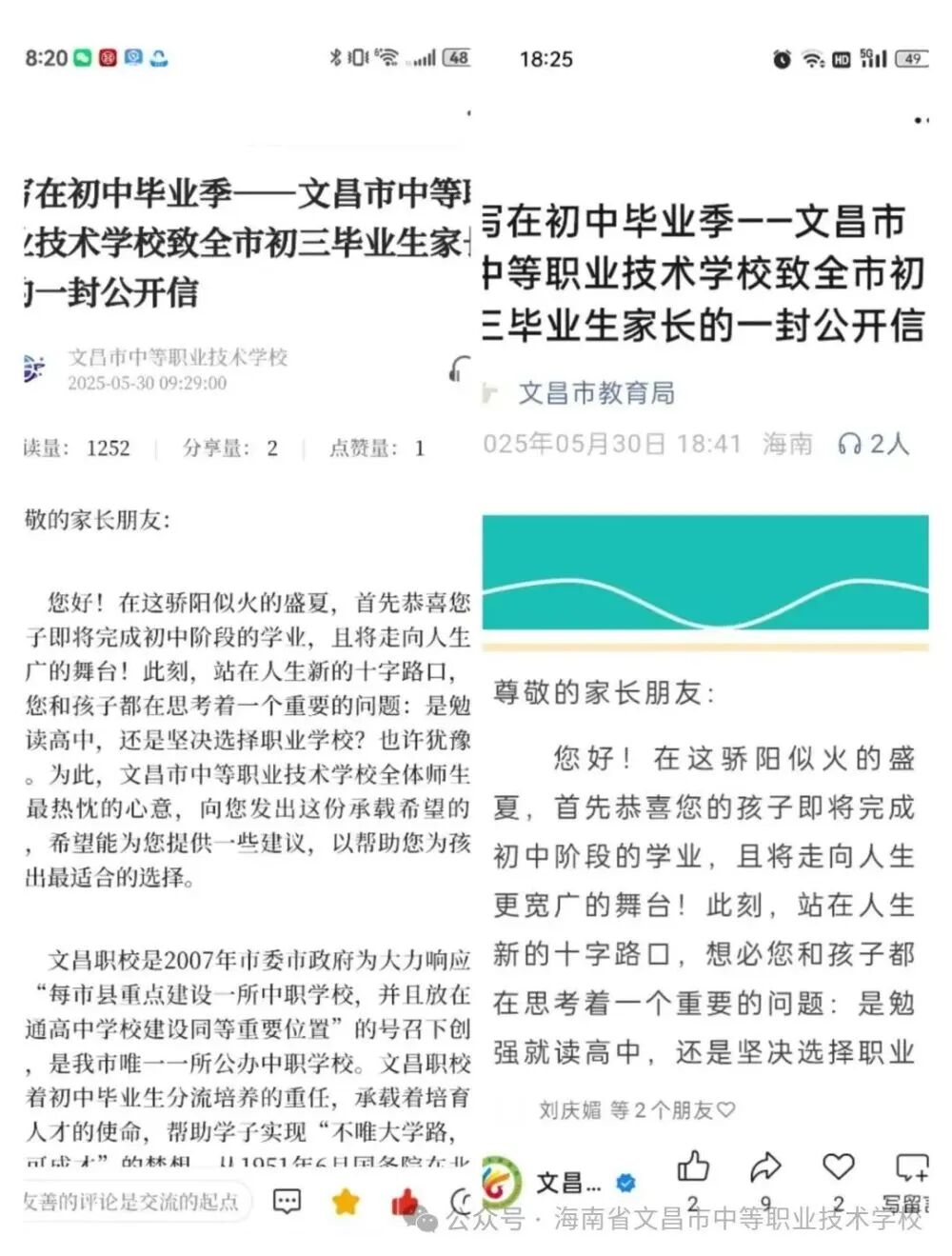 4月1日,我校发布《致初中毕业生及学生家长的一封信》,得到社会各界和媒体的广泛关注,云上文昌官方新闻客户端、市教育局官方公众号、文昌本地通等权威平台纷纷转发宣传,引起热烈反响。