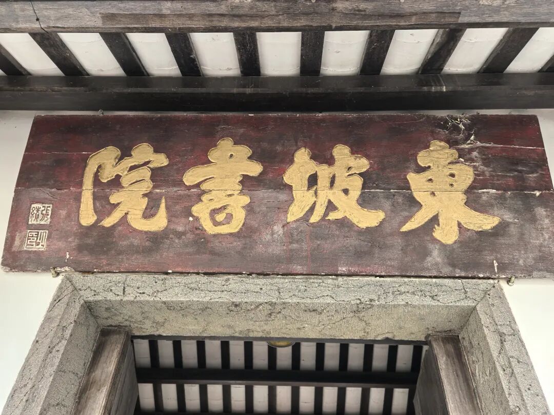 拾级而上青石阶,门头上匾额“东坡书院”,为清嘉庆年间举人、附近水井村人张绩所书。
