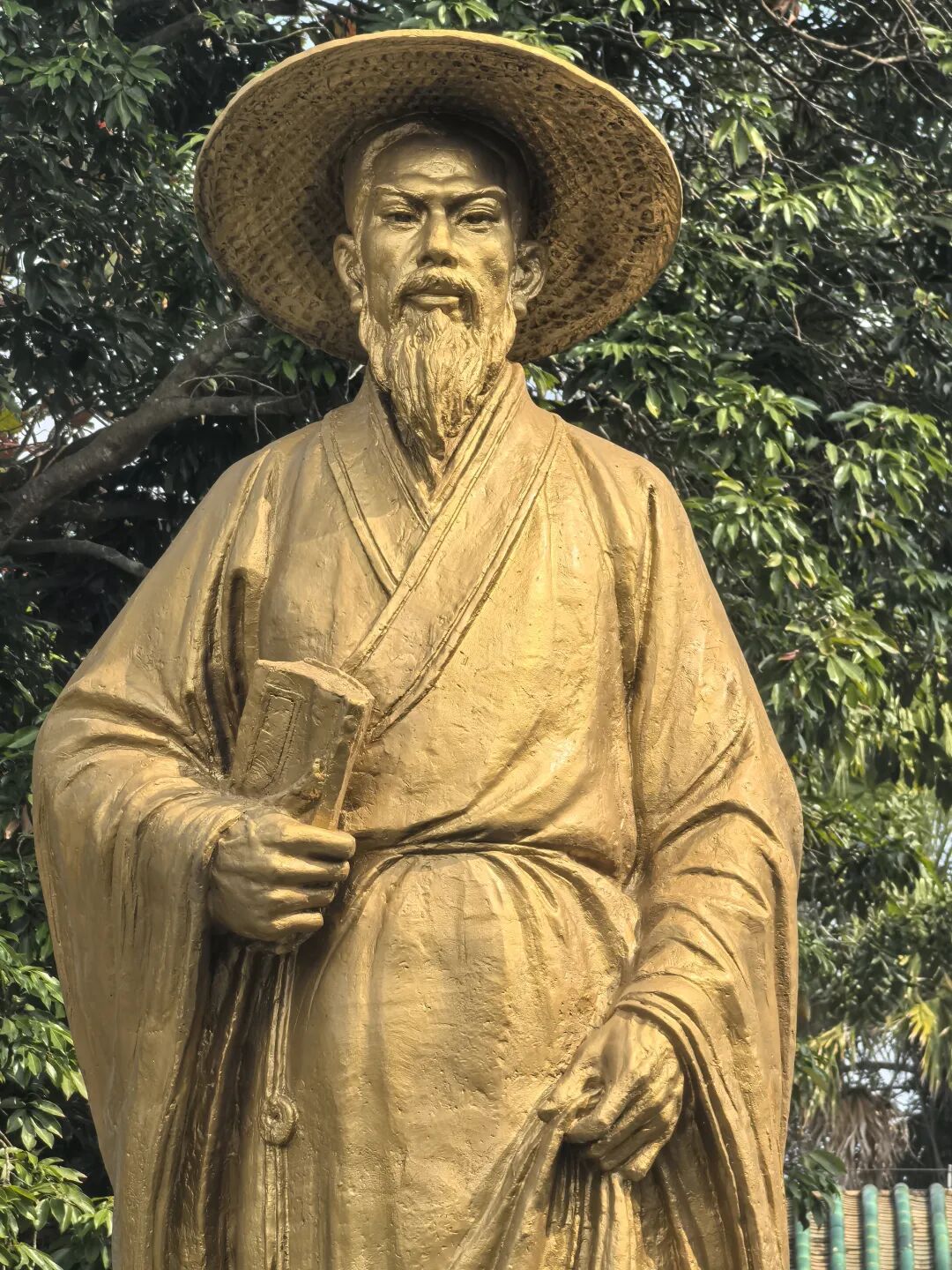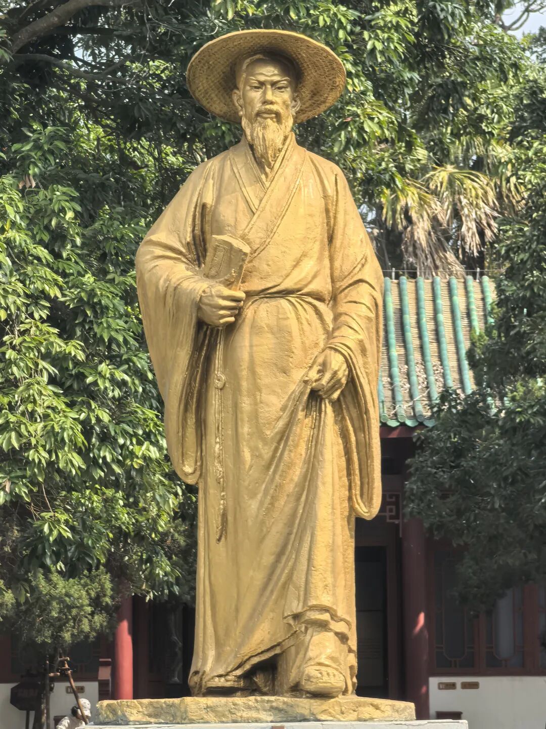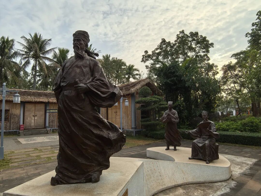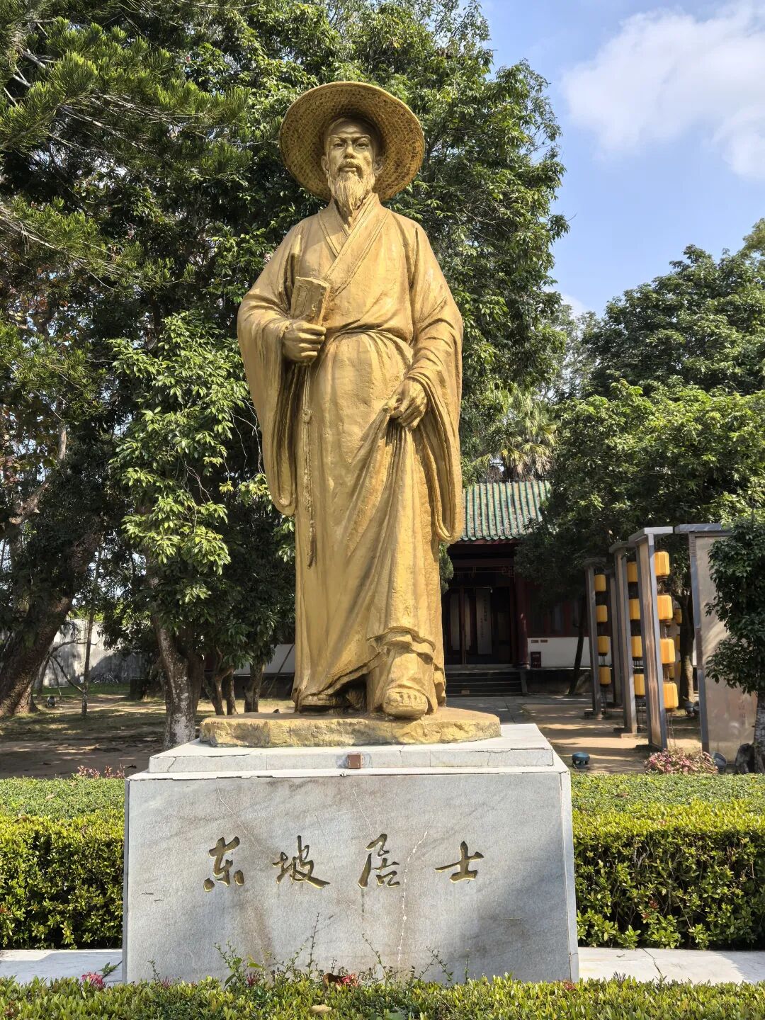 馆前方是东坡笠屐铜像,被称为海南三大雕塑之首,取材于《东坡笠屐图》,他头戴斗笠、脚穿木屐,旷达乐观、入乡随俗、与民相亲。其创作者是我国著名雕塑家李汉仪先生,汉白玉基座正面的“东坡居士”四个字,是郭沫若的手迹。