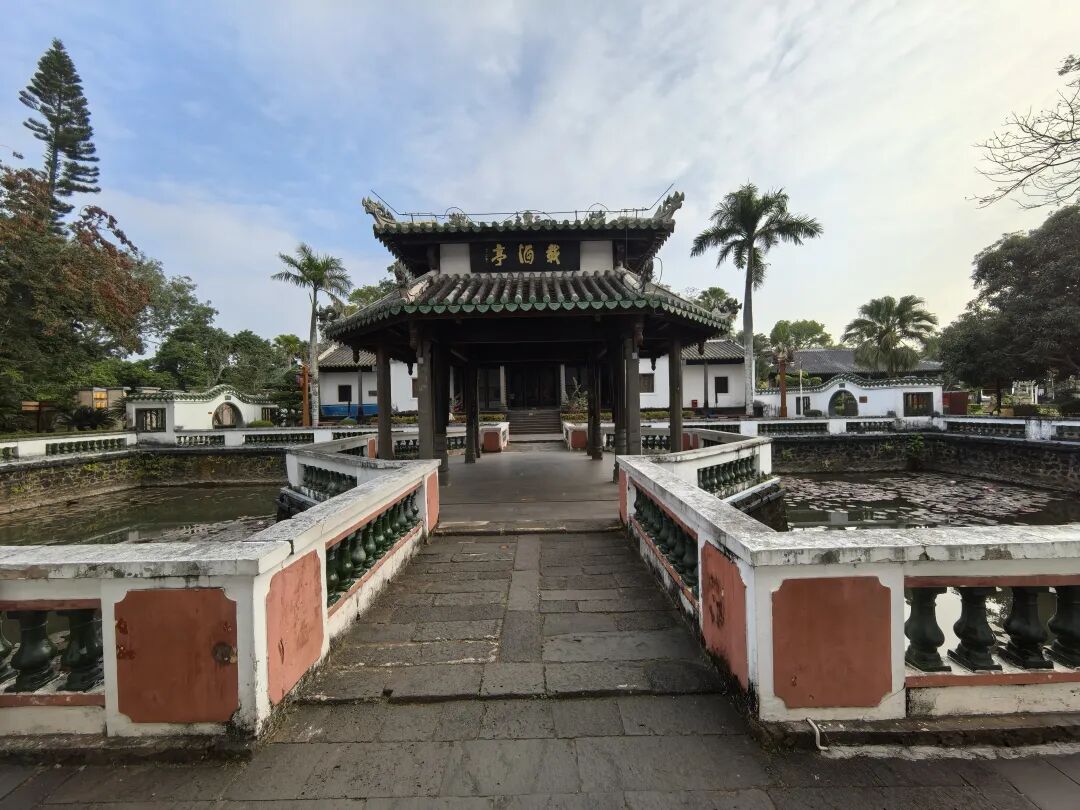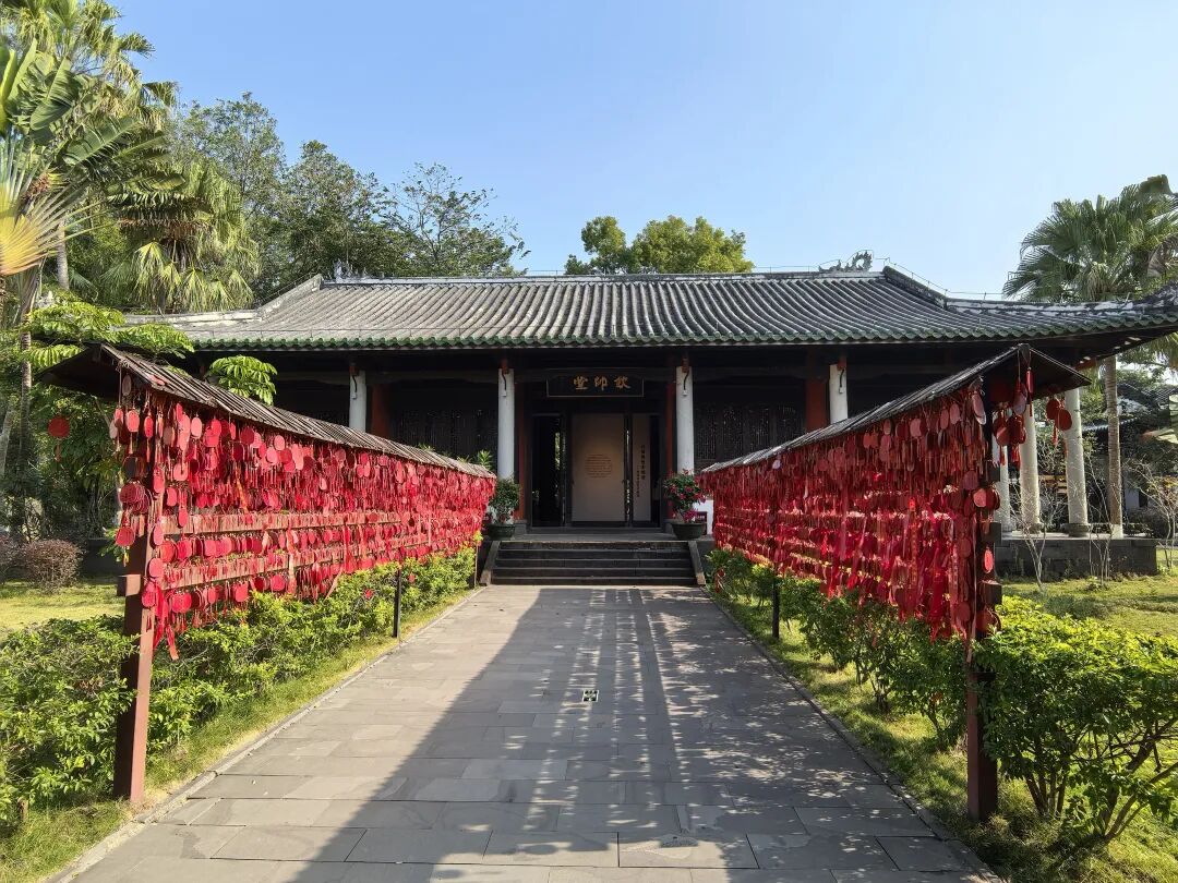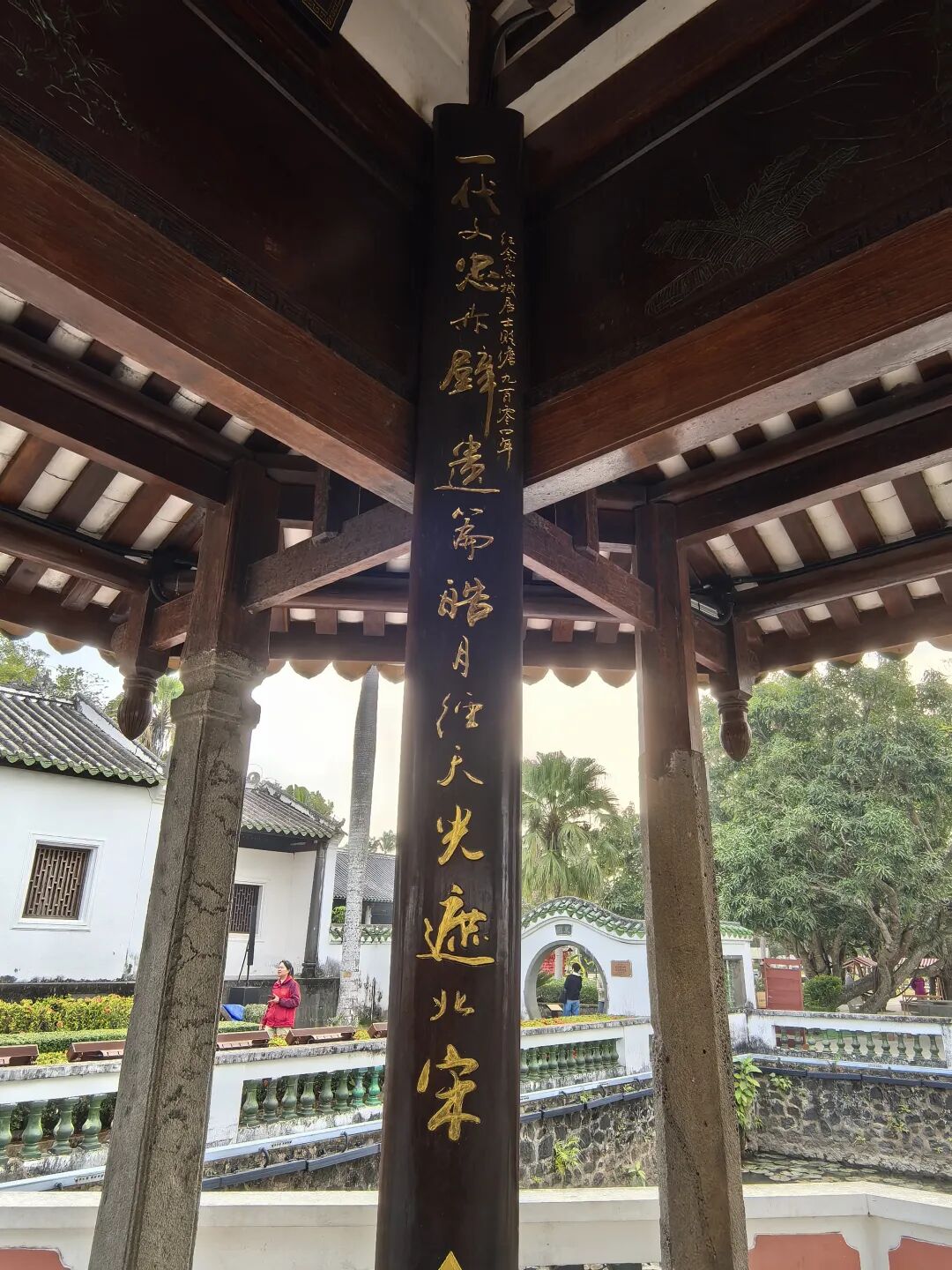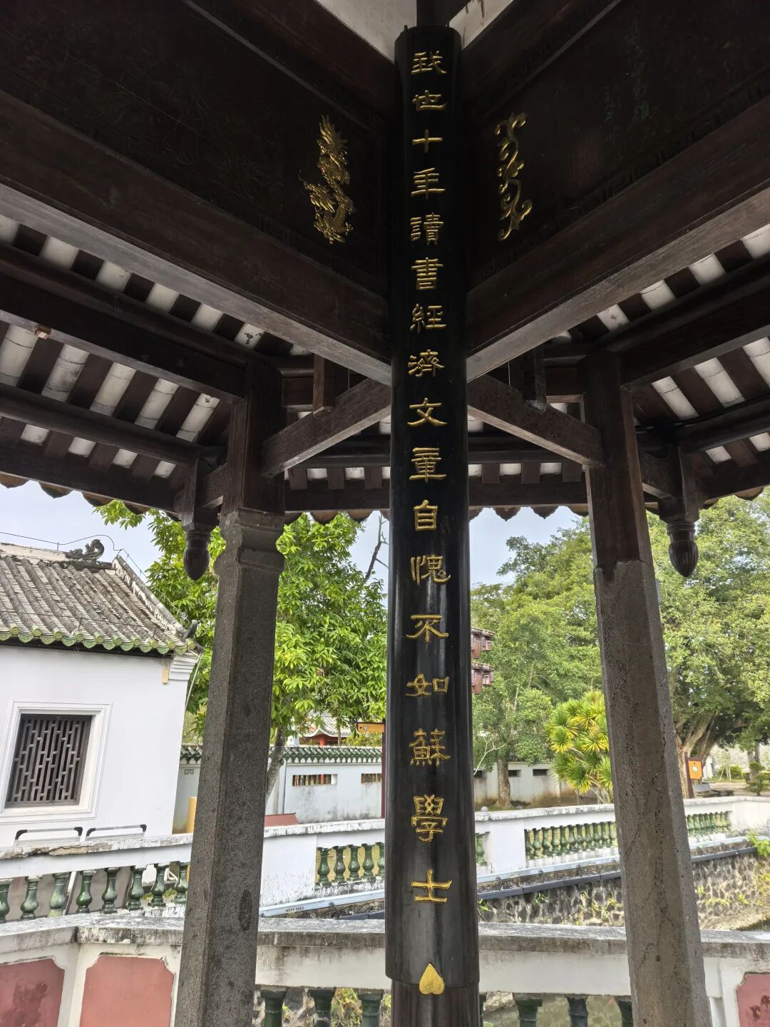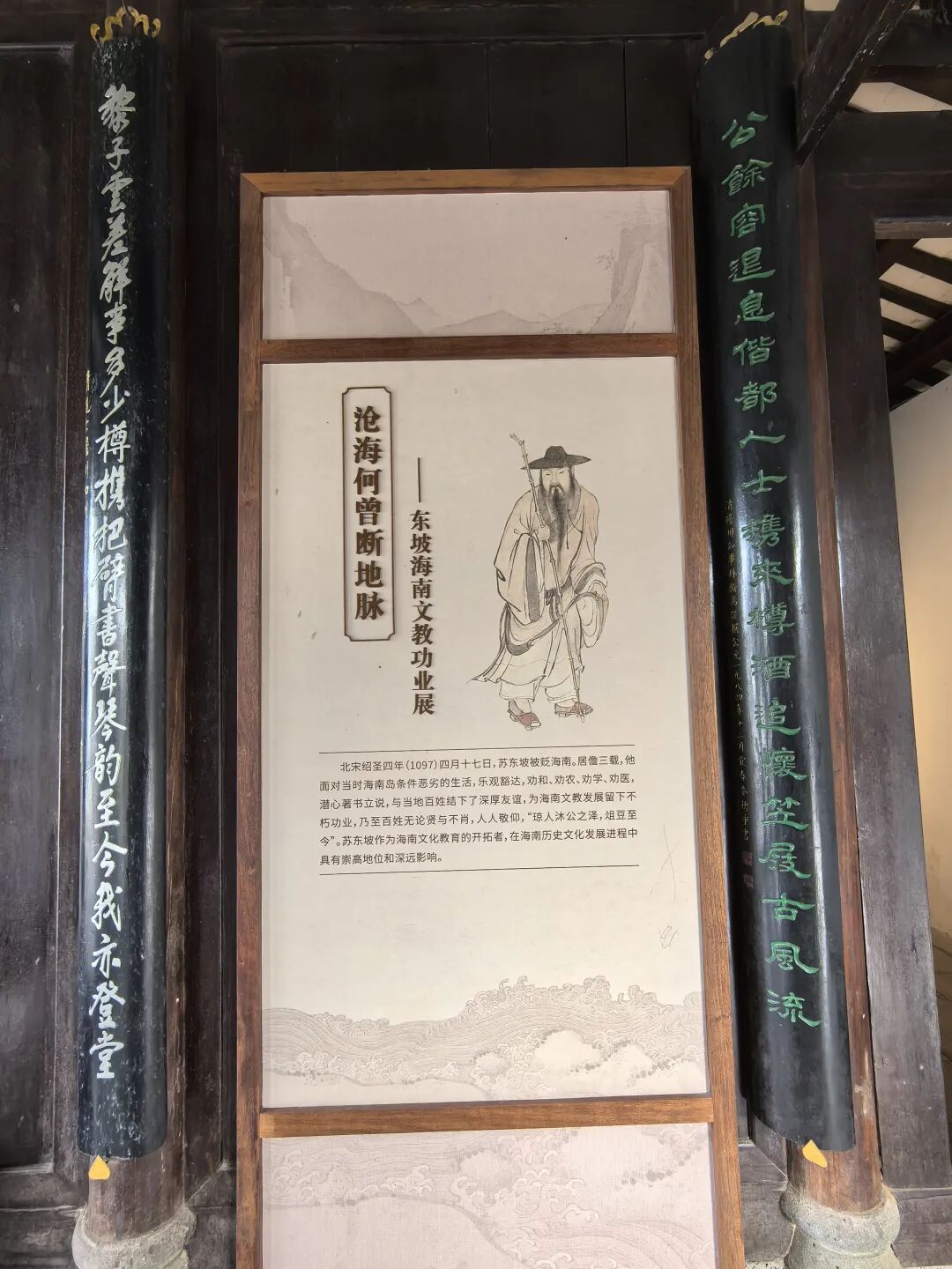 头顶这幅“鱼鸟亲人”匾额:由清朝儋州知州张霈题写。出自苏东坡《留别雩泉》中的诗句,寓意东坡认为儋州不仅山川秀美,人心友善,就连鱼鸟都懂人情、解人意,与人亲近。