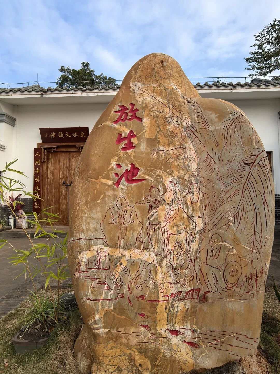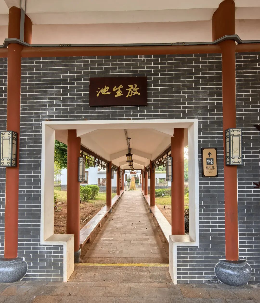 息轩右侧是放生池,再现了东坡《书城北放鱼》的情景,记录了东坡组织众人念佛放生的过程,体现他随遇而安、随缘放旷的人生境界。宋哲宗元符二年(1099年)二月二十四,苏东坡在城南桄榔庵附近买下二十一尾鲫鱼,到昌化军城北宜伦江南岸一位姓吴的人家附近浣纱石下进行放生。“其鱼皆随波赴谷,众会欢喜,作礼而退。”