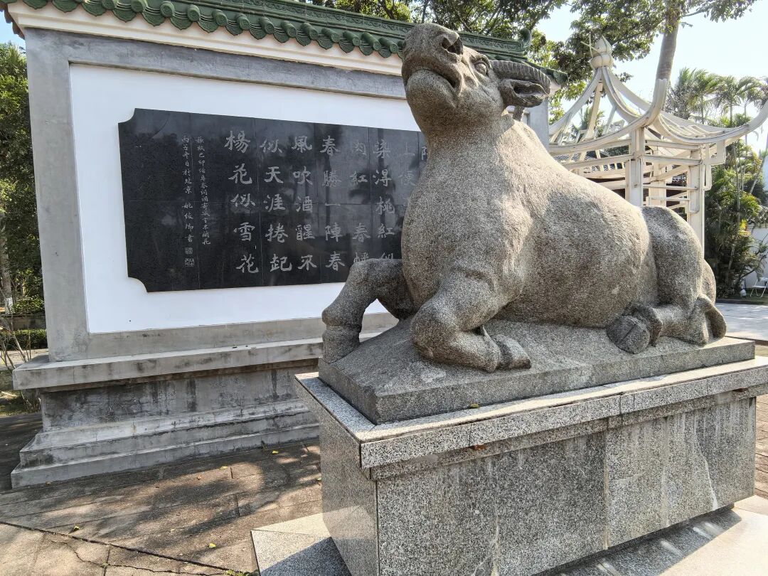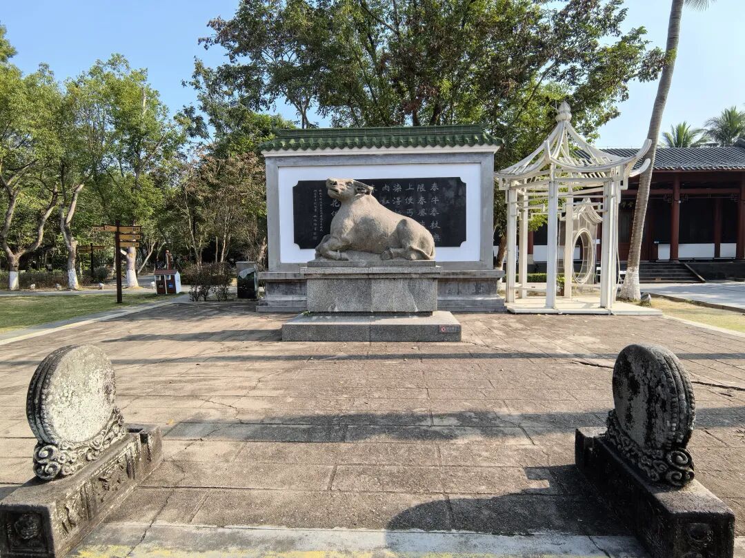堂右前方为春牛雕塑。北宋时期,当地的黎人思想落后,迷信盛行,他们用珍贵的沉香从内陆换取耕牛,常常是“一牛博香一担”,换来的牛却不用于农耕,而是搭起祭坛,杀牛祭神,导致农业生产一直停留在刀耕火种的原始状态。苏东坡对这此十分痛心,专门写了《书柳子厚〈牛赋〉后》等文章,劝导黎族同胞革除陋俗,珍惜耕牛。在他不遗余力的教化和启迪下,这种“杀牛祭神”的陋俗才得以杜绝。