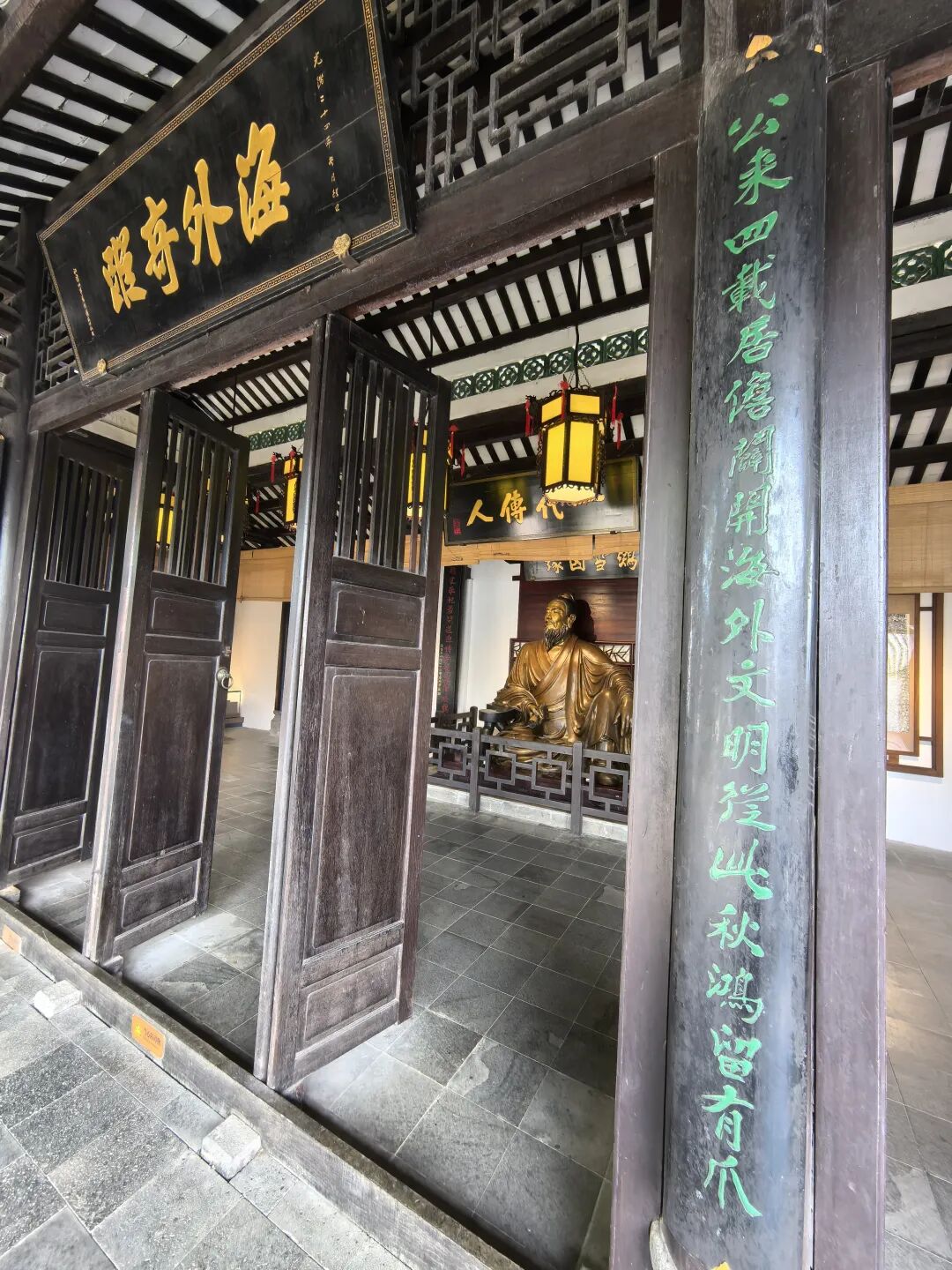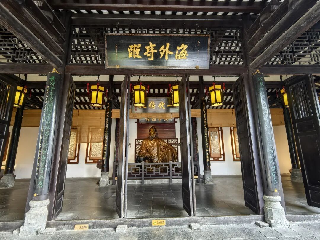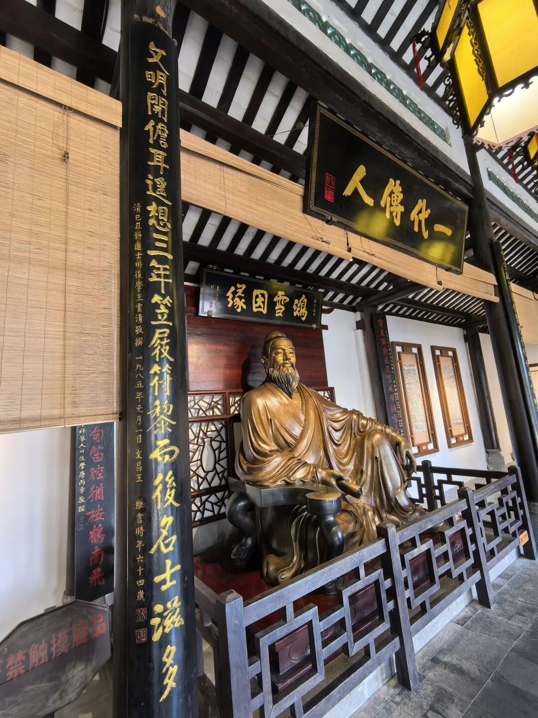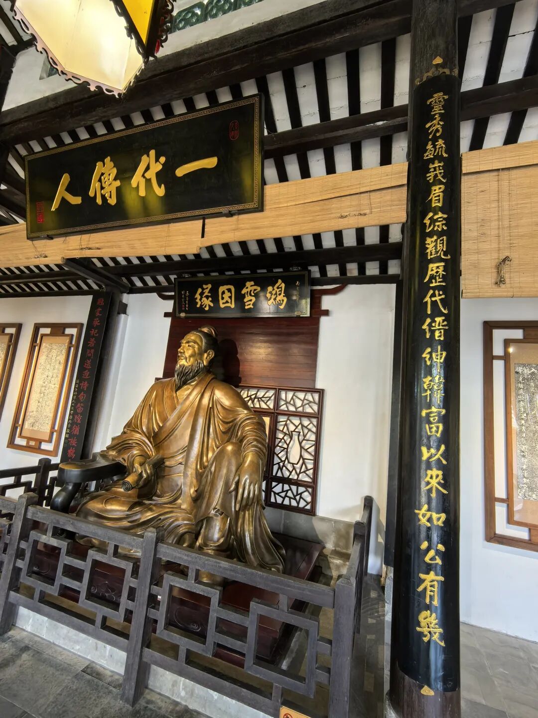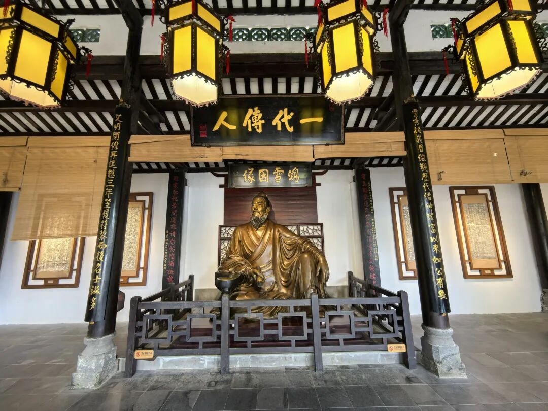殿中央的东坡铜像,东坡悠闲自在地坐在木椅上,手握书卷,凝视远方,沉静思索,给人留下丰富的想象空间。