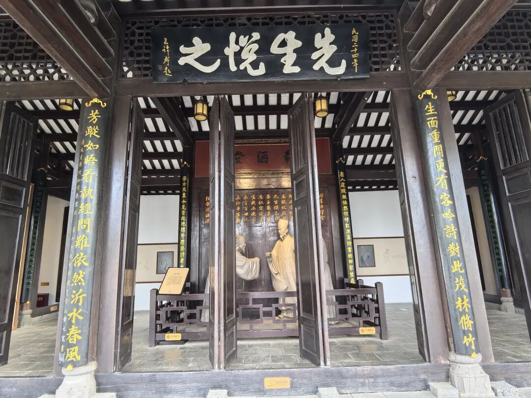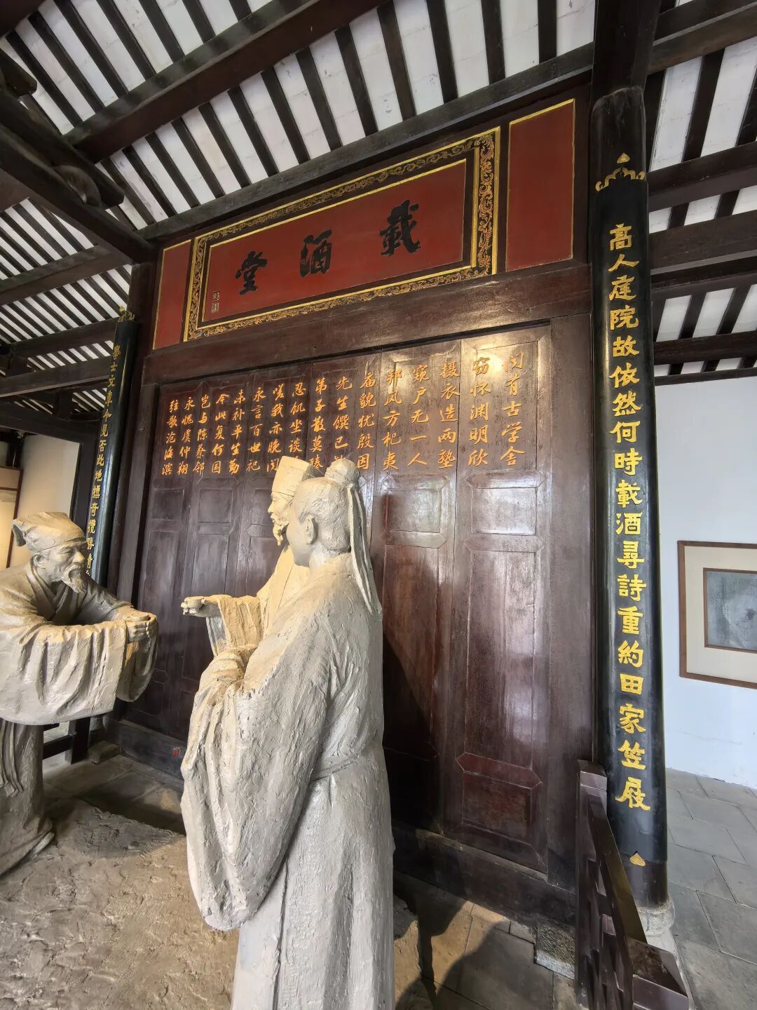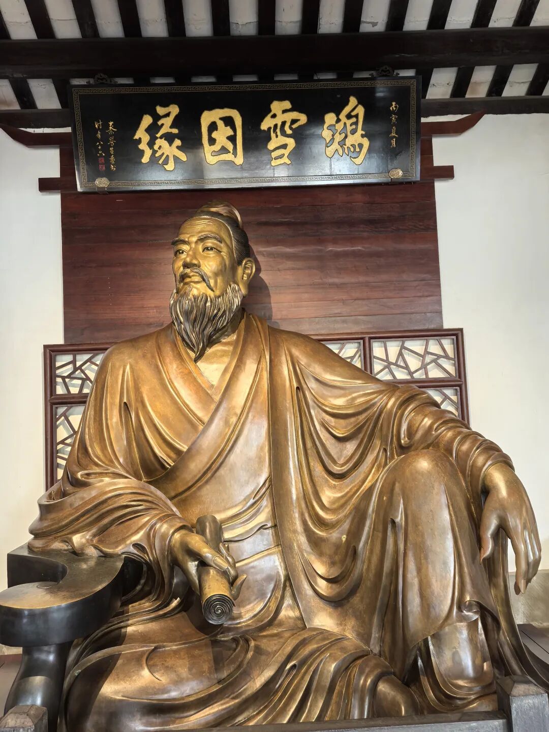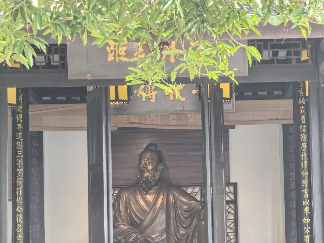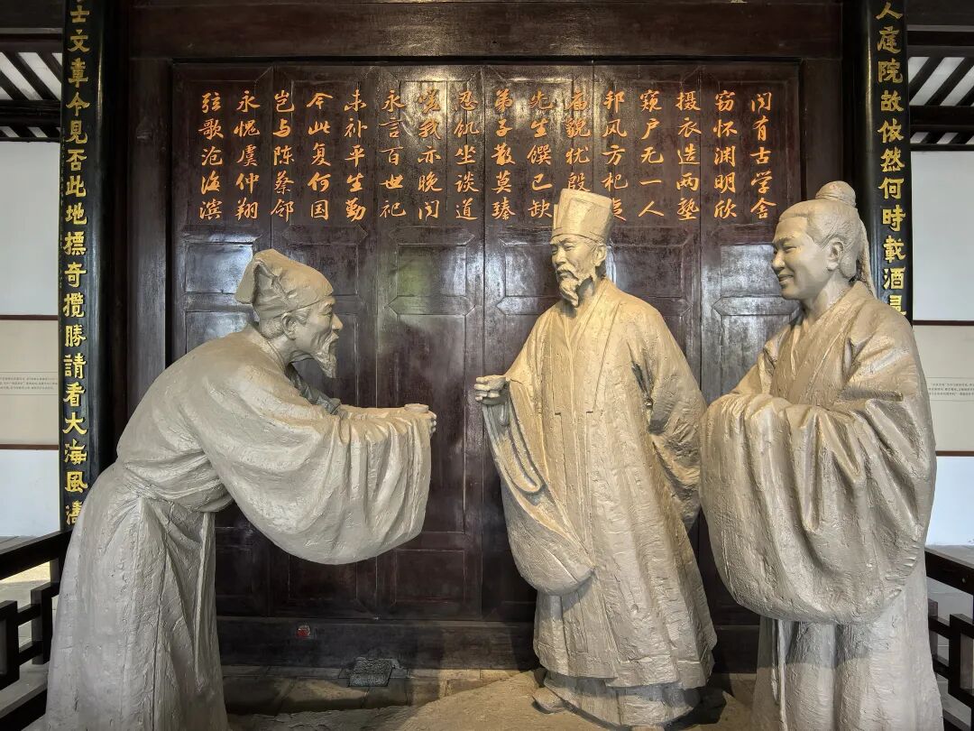 殿中央的东坡铜像,东坡悠闲自在地坐在木椅上,手握书卷,凝视远方,沉静思索,给人留下丰富的想象空间。