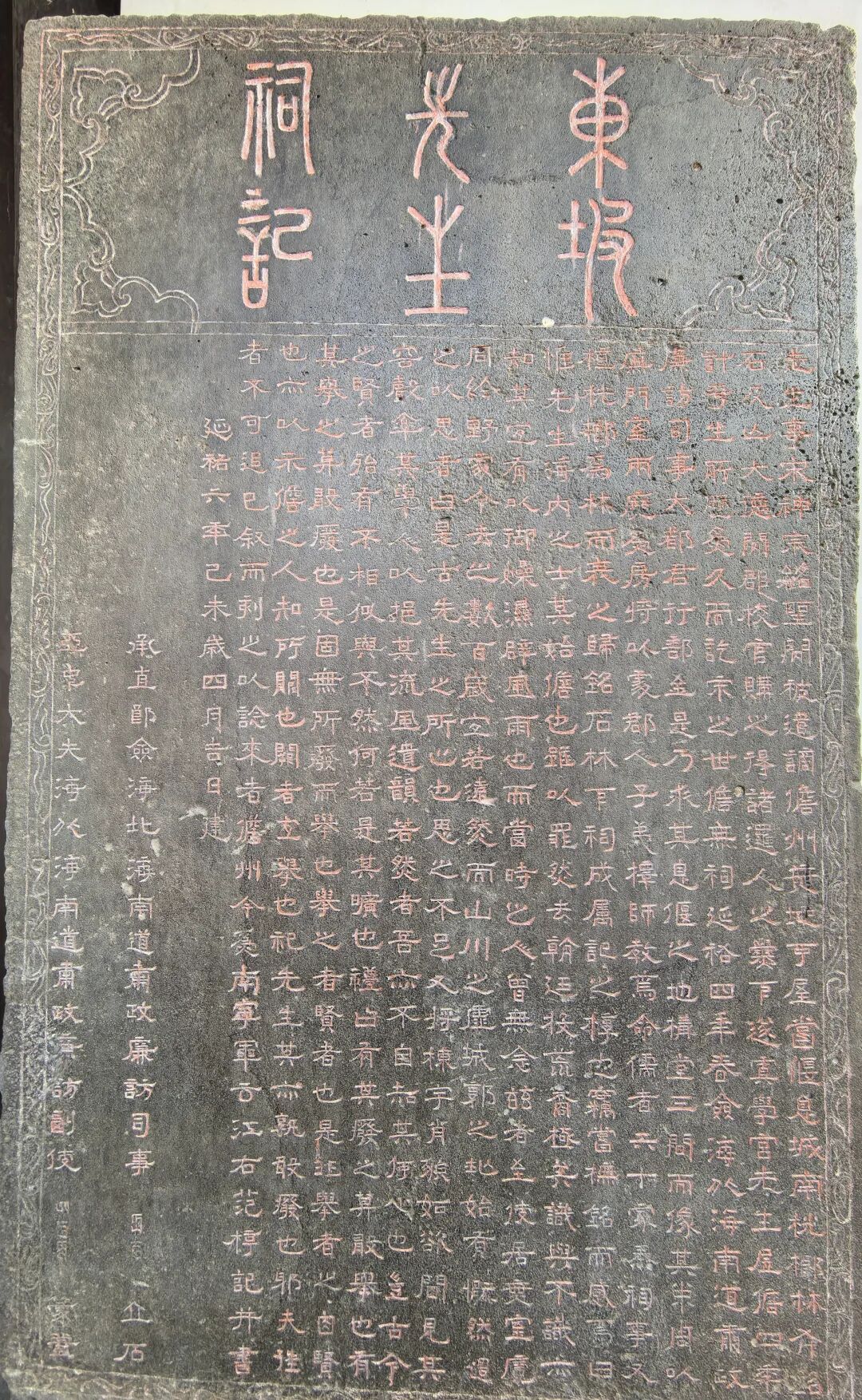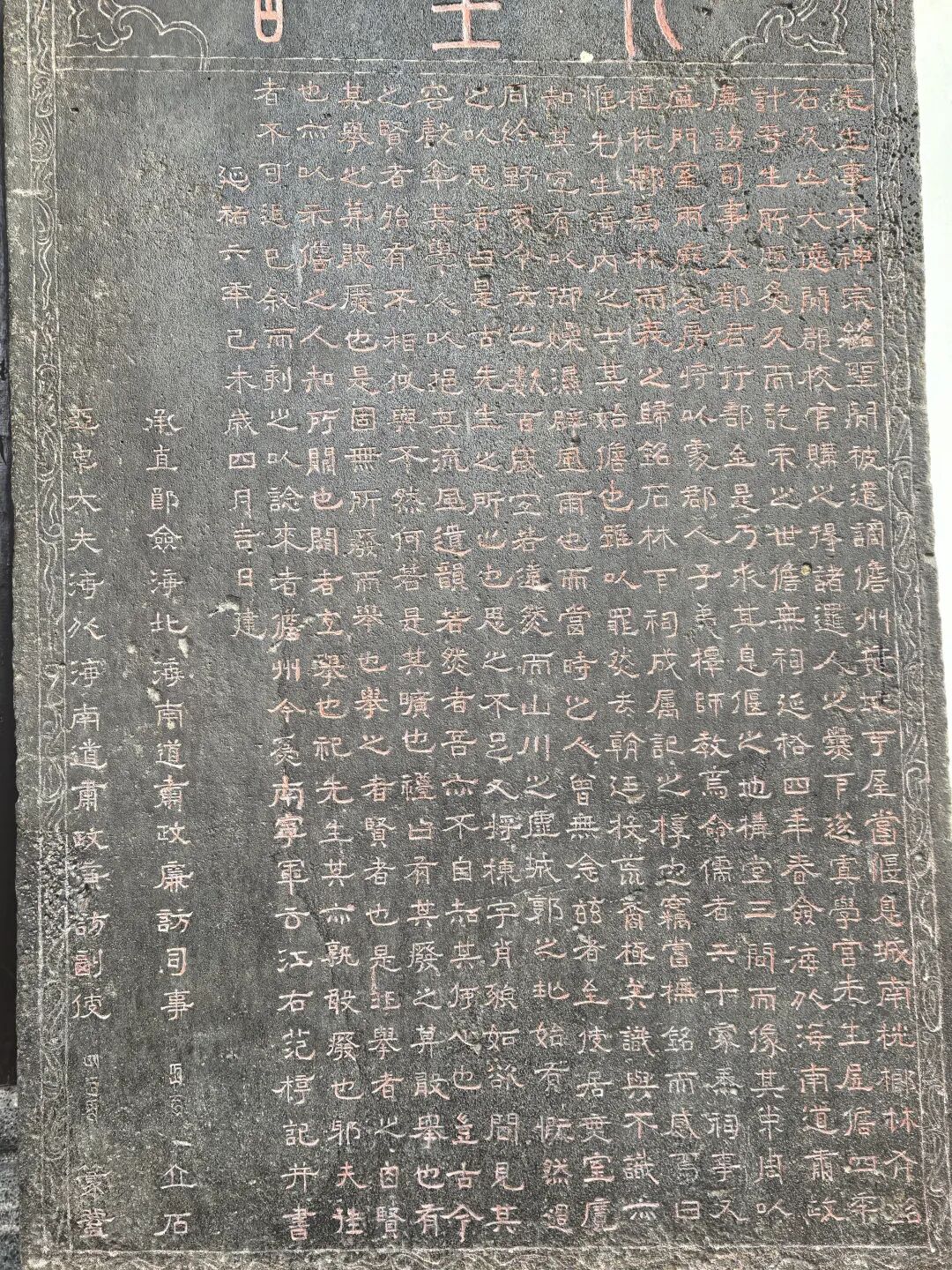 旁边这块钦帅泉碑,有碑阳文和碑阴文,为明代遗物,立于明万历二十三年(1595年),由当时的知州陈荣选立碑并撰写碑文。他在任期间,修缮了载酒堂,增建了载酒亭、钦帅堂,还编辑出版了《苏文忠公居儋录》,对保护东坡遗产功不可没。碑正面有铭文载: