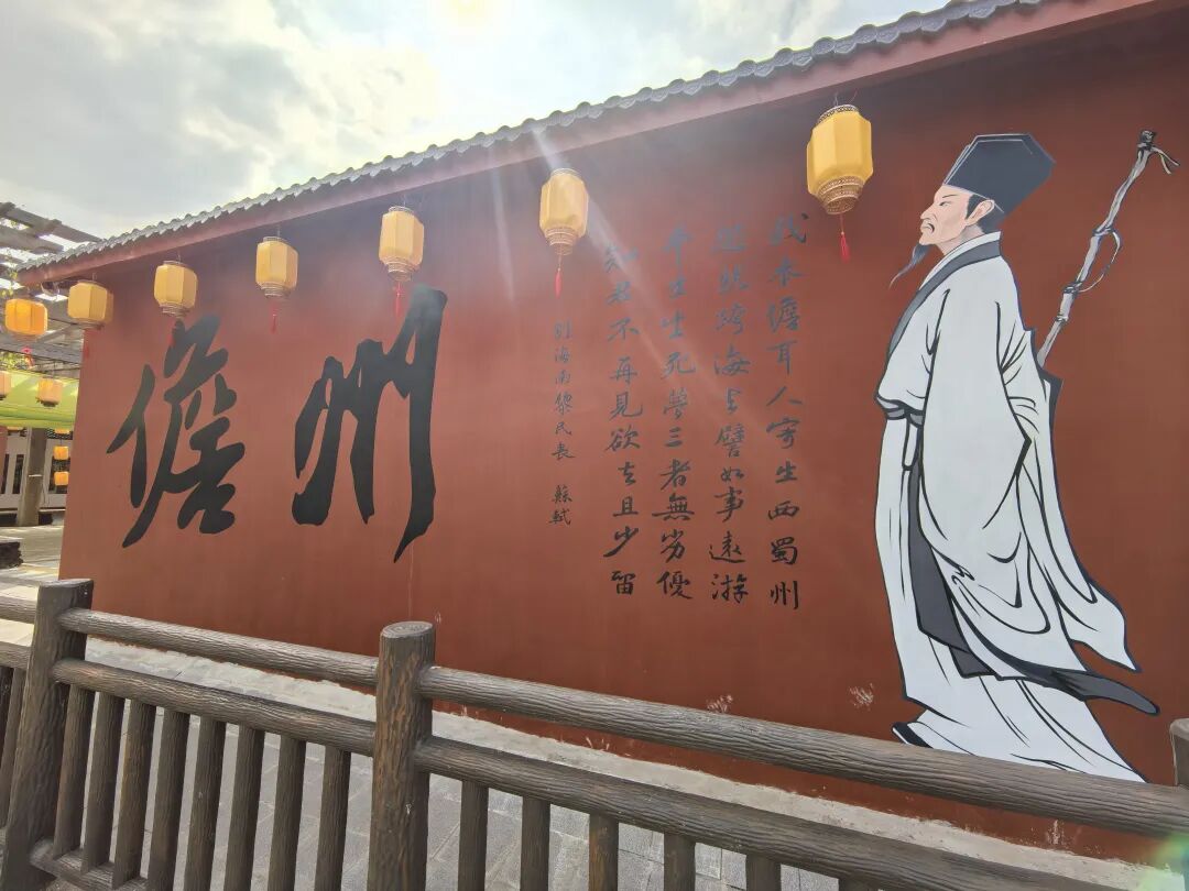 雕塑后面墙上刻有东坡为儋州人民创作的一首咏春词《减字木兰花·己卯儋耳春词》,由当代著名书法家姚俊卿书写。