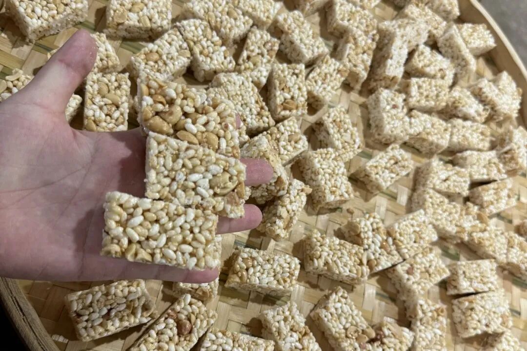 它也是一捧滚烫而复杂的甜。是年关将近,灶膛里柴火噼啪,大锅里糖浆金黄浓稠,与爆米花、花生、芝麻奋力翻炒融合而成的糖贡。