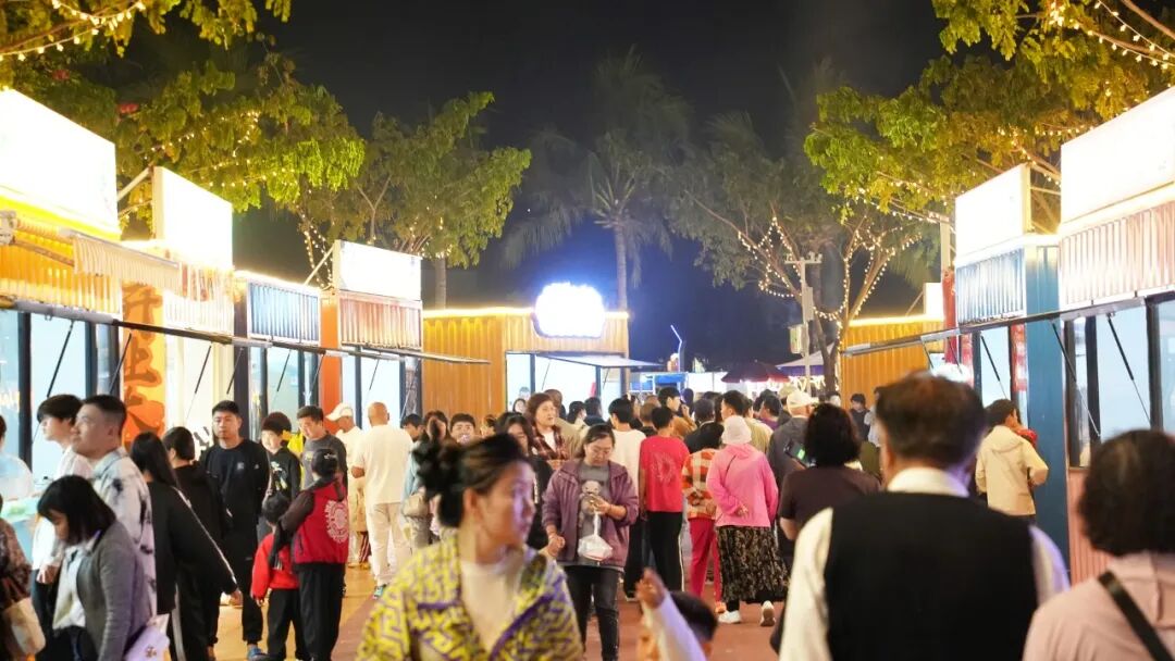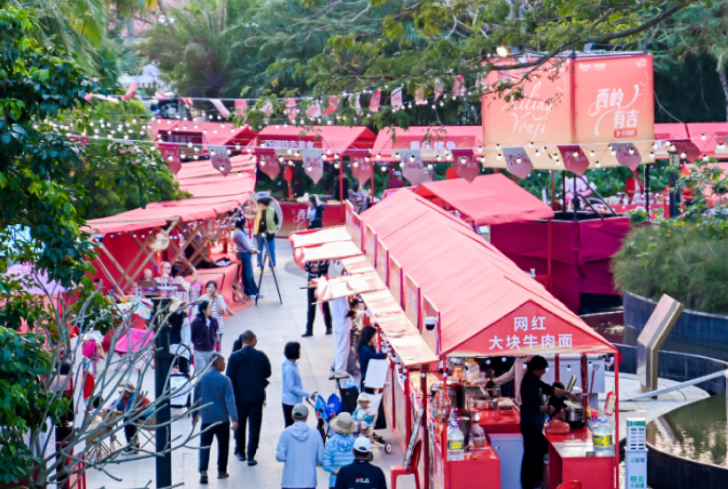 从脆皮红米肠、蒜香排骨到浓香番茄牛腩,西岭食集用美食讲述琼味故事。一旁的西岭集市,则汇聚老爸茶的闲适、手作的温度与新春的喜庆。这是一条“可逛可吃”的海岛生活街。